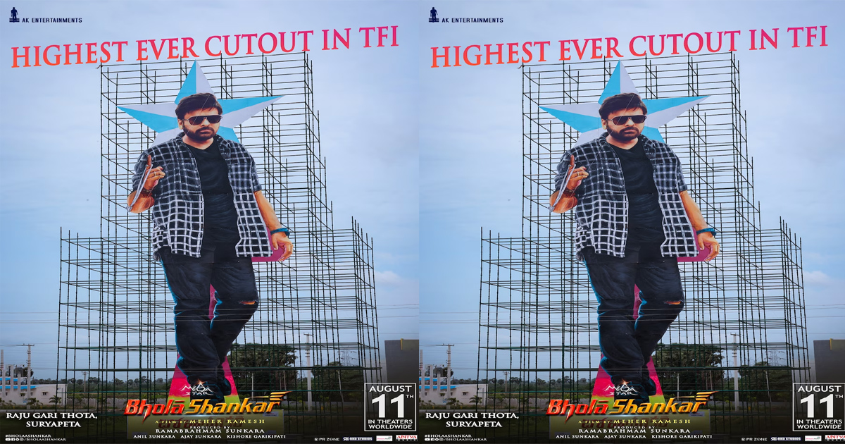 మరీ ఈ రెస్టారెంట్ నిర్మాత అనిల్ సుంకరకు చెందిందని కొద్ది మందికీ మాత్రమే తెలుసు. మరి ఆయన నిర్మాణంలో నిర్మించే సినిమాకు సంబంధించిన కటౌట్ ని ఆ రెస్టారెంట్ ముందు ఏర్పాటు చేయడం జరుగుతుంది. ఎప్పటికంటే ఈ సారి మెగాస్టార్ భోళా శంకర్ కటౌట్ ని అతి భారీగా ప్లాన్ చేశారు. రాజుగారితోట రెస్టారెంట్ ముందు ఏకంగా మెగాస్టార్ 126 అడుగుల కటౌట్ ని ఏర్పాటు చేశారు. ఇప్పటివరకు టాలీవుడ్ ఇండస్ట్రీలో ఇదే అతిపెద్ద కటౌట్ అని పేర్కొంటున్నారు. ఈ స్థాయిలో కటౌట్ ఇప్పటివరకు ఏ సినిమా కోసం ఏర్పాటు చేయలేదు. ఈ కటౌట్ తో మెగాస్టార్ చరిత్రనే సృష్టించాడు. భోళాశంకర్ రికార్డులను ఇక్కడి నుంచే ప్రారంభించేశాడు. దీంతో మెగా అభిమానులు ఈ కటౌట్ ని సోషల్ మీడియాలో షేర్ చేస్తూ తెగ సందడి చేస్తున్నారు.