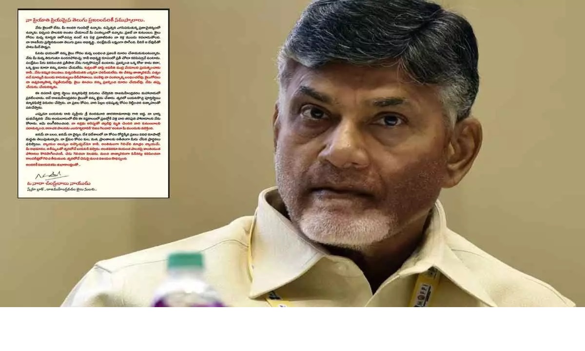 నలభై ఐదేళ్లుగా నేను కాపాడుకుంటూ వస్తున్నా నా విశ్వసనీయతను, విలువలను ఎవ్వరూ చెరిపివేయలేరని.. ఒక్క క్షణం కూడా ఎవ్వరు తనని ప్రజల నుంచి వేరు చెయ్యలేరని చంద్రబాబు నాయుడు రాసారు. ఆలస్యమైనా న్యాయం గెలుస్తుంది.. త్వరలోనే బయటకు వస్తాను.. రాష్ట్ర ప్రగతి కోసం రెట్టించిన ఉత్సాహంతో పని చేస్తానని ఆయన చెప్పుకొచ్చారు. నేను జైలులో లేను.. విధ్వంస పాలనని అంతం చేయాలనీ ఎదురు చూస్తున్న మీ సంకల్పంలో ఉన్నానని అన్నారు. జైలు గోడల మధ్య ఆలోచనల్లో నా నలభై ఐదేళ్ల ప్రజా జీవితం కళ్ళ ముందు కదులుతోంది.