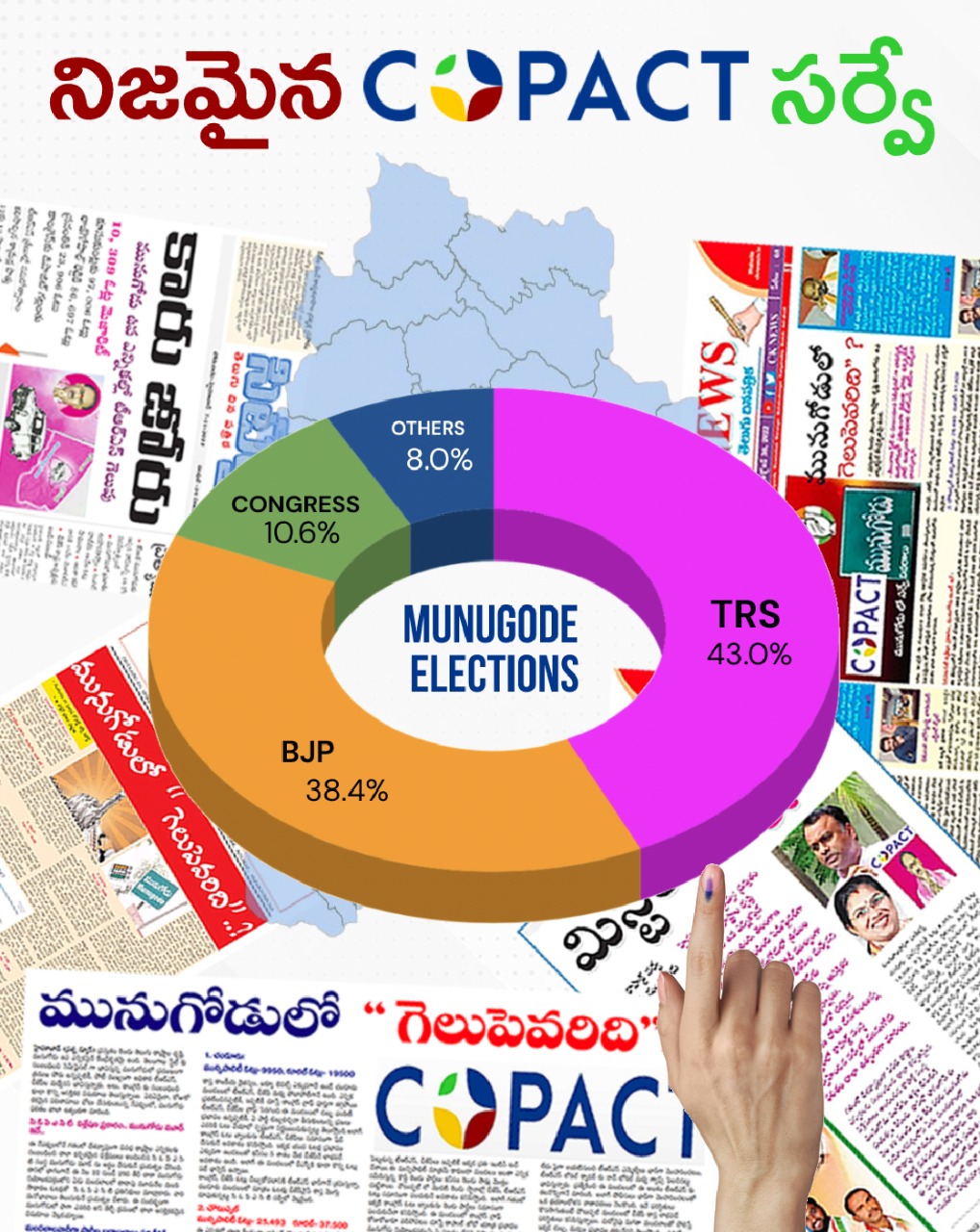 ఎన్నికలకు 15 రోజుల ముందు ఒక సర్వే, ఎన్నికలకు నాలుగు రోజుల ముందు మరో సర్వే చేపట్టింది “COPACT” సంస్థ. టీఆర్ఎస్ కి 41 శాతం ఓట్లు వస్తాయని, బీజేపీ కి 36 శాతం ఓట్లు వస్తాయని వెల్లడించింది. “COPACT” సర్వే ప్రకారం.. టీఆర్ఎస్ కి 42 శాతం ఓట్లు వచ్చాయి. దీంతో టీఆర్ఎస్ అభ్యర్థి కూసుకుంట్ల ప్రభాకర్ రెడ్డి విజయం సాధించారు. 2020 జీహెచ్ఎంసీ ఎన్నికల సమయంలో కూడా “COPACT” సర్వే ప్రకారమే ఫలితాలు వచ్చాయి. మునుగోడు అసెంబ్లీ నియోజకవర్గంలో కూడా “COPACT” సంస్థ చేసిన సర్వే అనుకున్న ఫలితం అందించింది. ముందు ముందు కూడా ఇలాంటి వాస్తవమైన సర్వేలు అందించాలని ఆశీద్దాం
