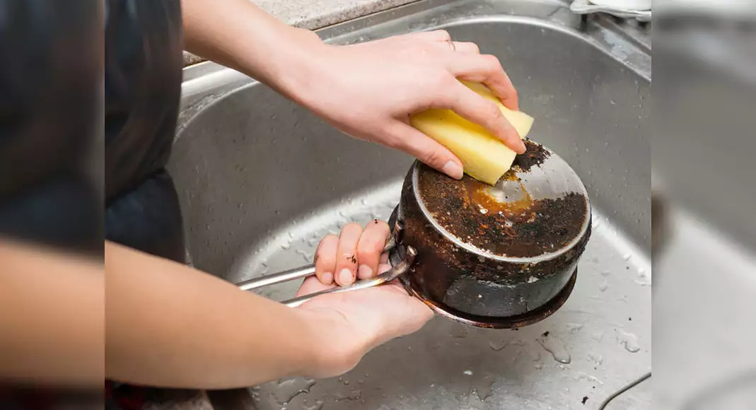 ముందుగా పాన్ ను వేడి చేసి అందులో మూడు నుంచి నాలుగు గ్లాసుల నీటిని మరిగించాలి. దీని తర్వాత రెండు టీ స్పూన్ల సరుపు, ఒక టీస్పూను ఉప్పు, నిమ్మరసం వేసి ఐదు నిమిషాల పాటు అలాగే ఉంచండి. తర్వాత ఈ వేడి నీటిని తీసివేసి స్కబ్బర్ తో రాస్తే అంతా పోతుంది.