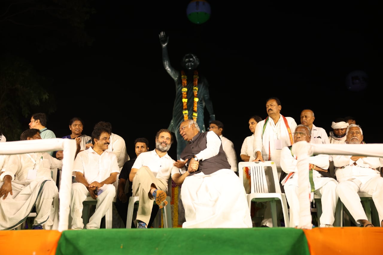 అటు కేంద్రంలో ఇటు రాష్ట్రంలో ప్రభుత్వాన్ని ఏర్పాటు చేయించాలని తెగ కష్టపడుతోంది కాంగ్రెస్ పార్టీ. రాహుల్ గాంధీ భారత్ జోడో యాత్ర పేరుతో కన్యాకుమారి నుంచి కాశ్మీర్ కు పాదయాత్ర చేస్తున్నారు. ఇది హైదరాబాద్ మహానగరానికి చేరుకుంది. ఈ సందర్భంగా నెక్లెస్ రోడ్డు దగ్గరలోని ఇందిరాగాంధీ విగ్రహం దగ్గర బహిరంగ సభ ఏర్పాటు చేశారు కాంగ్రెస్ శ్రేణులు. దీనికి కాంగ్రెస్ నూతన అధ్యక్షుడు ఖర్గే కూడా హాజరయ్యారు.