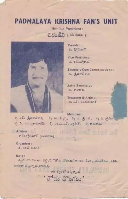 కృష్ణ అభిమాన సంఘాలు ఉమ్మడి ఆంధ్రప్రదేశ్ తో తమిళనాడు, కర్ణాటకలోనూ ఉండేవట. 1981లో తోడుదొంగలు సినిమా రిలీజ్ కి ముందు ‘పద్మాలయ కృష్ణ ఫ్యాన్స్ యూనిట్’ పేరుతో అప్పట్లో ఓ కరపత్రం విడుదల చేశారు. అందులో ఆ ఫ్యాన్స్ యూనిట్ కి గౌరవ అధ్యక్షుడిగా చిరంజీవి పేరు ఉండడం గమనార్హం. అంతేకాదు, కృష్ణతో కలిసి ఆ సినిమాలో చిరంజీవి కూడా యాక్ట్ చేశారు. ఇప్పుడు మరోసారి ఆ కరపత్రం సోషల్ మీడియాలో చక్కర్లు కొడుతోంది. టాలీవుడ్ లో మూడు షిఫ్ట్ లోను పనిచేసిన అతి కొద్ది నటుల్లో కృష్ణ ఖచ్చితంగా ముందు వరుసలో ఉంటారు. దాదాపు 340 కి పైగా చిత్రాల్లో నటించిన కృష్ణ, ఒకే ఏడాది అత్యధిక చిత్రాల్లో నటించిన హీరోగా అప్పట్లో సరికొత్త రికార్డు నెలకొల్పారు. 1972లో కృష్ణ ఏకంగా 18 సినిమాల్లో యాక్ట్ చేశారు.