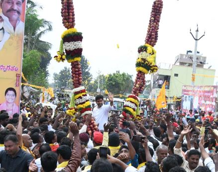తమ అభిమాన నాయకుడికి స్వాగతం పలికేందుకు భారీ దండను సిద్ధం చేశారు టీడీపీ నేతలు, కార్యకర్తలు. మామూలుగా దండ పూలతో చేస్తారు. కానీ, ఇక్కడ మాత్రం 300 కేజీల ఆపిల్స్ తో తయారు చేయించారు. అలాగే, అందులో పూలను కూడా ఉంచారు. మాజీ మంత్రి అమర్నాథ్ రెడ్డి ఆధ్వర్యంలో ఈ స్వాగత కార్యక్రమం జరిగింది. మహిళలు అడుగడుగునా హారతులతో లోకేష్ కు వెల్ కమ్ చెప్పారు. క్రేన్ సాయంతో ఈ భారీ ఆపిల్స్ దండను లోకేష్ కు వేశారు.