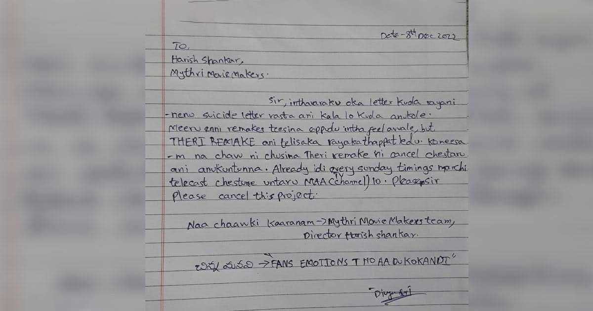 మీరు ఎన్ని రీమేక్ సినిమాలు తీసిన నేను ఎప్పుడూ ఇంతగా ఫీల్ అవ్వలేదు. కానీ తేరీ రీమేక్ అని తెలిశాక రాయక తప్పలేదు. ఈ లెటర్ చూసిన తర్వాత అయినా ఈ సినిమాని క్యాన్సల్ చేస్తారని అనుకుంటున్నా. ఇప్పటికే ప్రతి ఆదివారం టైమింగ్స్ మార్చి తేరీ మూవీని టీవీల్లో ప్రసారం చేస్తున్నారు. ప్లీజ్ సార్.. ఈ ప్రాజెక్టుని క్యాన్సిల్ చేయండి. నా చావుకి కారణం మైత్రి మూవీ మేకర్స్ నిర్మాతలు, దర్శకుడు హరీష్ శంకర్” అని లేఖ రాసి తనువు చాలించింది ఆ యువతి. ఈ లేఖపై మైత్రి నిర్మాతలు, హరీష్ శంకర్ ఏ విధంగా స్పందిస్తారో వేచి చూడాలి.