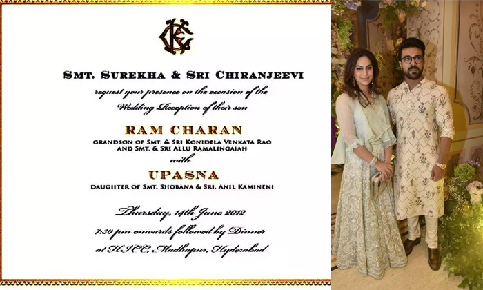 ఇక తండ్రి మాదిరిగానే మెగా పవర్ స్టార్ రామ్ చరణ్ వివాహపత్రికను కూడా చాలా సింపుల్ గా ఇంగ్లీష్ లోనే డిజైన్ చేశారు.