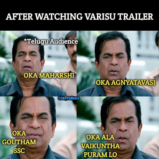 ఇదిలా ఉండగా, తాజాగా ట్రైలర్ ను రిలీజ్ చేశారు మేకర్స్. ట్రైలర్ బాగానే ఉంది కానీ, ఈ ట్రైలర్ చూస్తున్న జనాలకు చాలా తెలుగు సినిమాలు మైండ్ లో స్ట్రైక్ అవుతున్నాయి. లక్ష్మీ, బ్రహ్మోత్సవం, మహర్షి, అజ్ఞాతవాసి, అలా వైకుంఠపురంలో, టచ్ జగదీష్, ఇలా చాలా సినిమాల ఛాయలు కనిపిస్తున్నాయి అన్నది వాస్తవం. ఇన్నాళ్లు ఒక్క మహర్షినే అనుకున్నాం. ట్రైలర్ చూస్తే, శ్రీమంతుడు, బృందావనంతో పాటు పేరు గుర్తుకురాని మరికొన్ని సినిమాలు కళ్ళ ముందు కనిపిస్తున్నాయి. ఇంతటి దానికి విజయ్ ని తెలుగులోకి తీసుకురావాలా? చిరంజీవి, బాలయ్య లాంటి సీనియర్ స్టార్లను పక్కనపెట్టి తెలుగునాట వారసుడుకి ఎక్కువ థియేటర్లు కేటాయించాలా? అంటూ కామెంట్స్ చేస్తున్నారు. అందుకే సోషల్ మీడియాలో మీమ్స్ వేసి ఈ ట్రైలర్ ను ట్రెండ్ చేస్తున్నారు. వారసుడు ట్రైలర్ పై ట్రెండ్ అవుతున్న మీమ్స్ ను మీరు కూడా ఓ లుక్కేయండి.