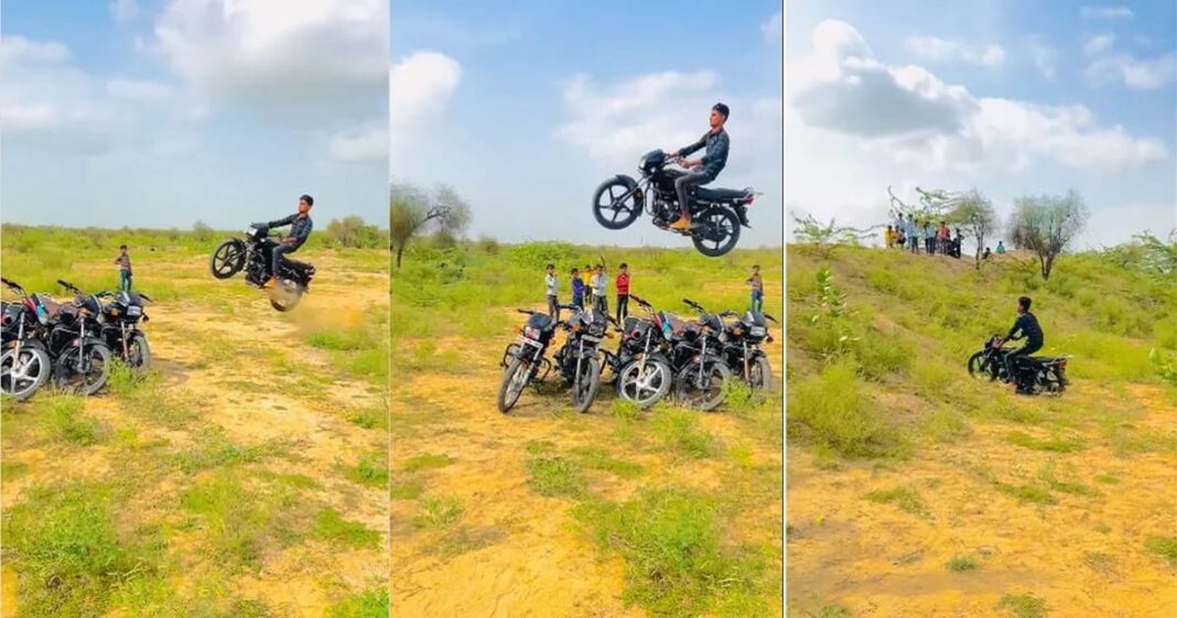 స్ప్లెండర్లో ఉన్న బైకర్ అధిక వేగంతో వాలుకు చేరుకొని స్ప్లెండర్ బైక్ ను లిఫ్ట్ చేసి ఆ ఐదు బైక్ పైనుంచి ఎంతో తేలికగా బైక్ తో పాటు జంప్ చేశాడు. ఐదు బైక్స్ పైనుంచి జంప్ చేసిన తర్వాత వేగంగా వచ్చి నేలకు కొట్టుకోవడం ఈ వీడియోలో కనిపిస్తుంది. కానీ అతను నైపుణ్యం కలవాడిగా ఎటువంటి పొరపాటు లేకుండా బైక్ తో ముందుకు సాగిపోయాడు.